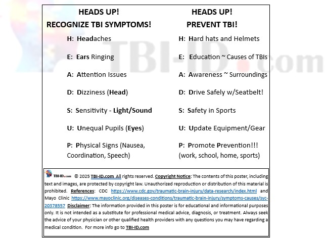 My Mission is to Prevent Traumatic Brain Injuries by sharing safety tips for AWARENESS and PREVENTION with the HEADS UP! posters.